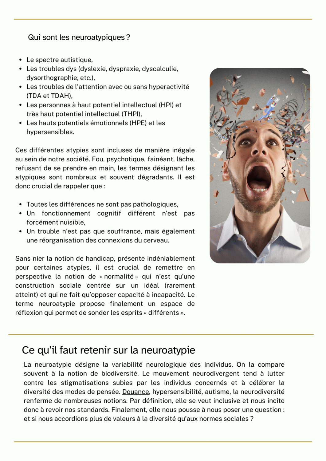 Tu te sens parfois « trop » ou « pas assez » ? Tu viens de recevoir un diagnostic (HPI, TDAH, TSA, hypersensibilité…) ou tu veux simplement mieux comprendre ton fonctionnement atypique ?